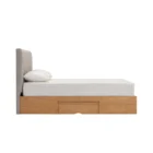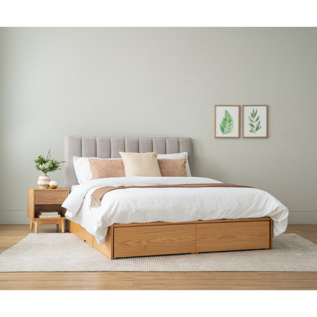 The headboard, upholstered in Greymist Belfast fabric, adds a soft texture and contemporary touch, while the Natural Oak body introduces warmth and timeless charm. Designed to fit a 1530mm × 1930mm mattress, the Mola Bed delivers comfort, durability, and elegant design in one cohesive piece.