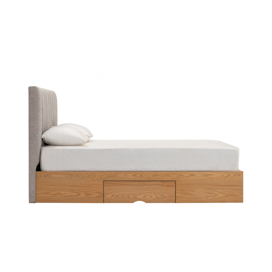 The Mola Queen Bed with Storage blends Mid-Century Modern design with practical functionality, making it perfect for modern bedrooms that value both style and space efficiency. Crafted with a durable MDF and ash veneer frame, it features a built-in storage system that keeps your space organized while maintaining a sleek, minimalist profile.