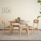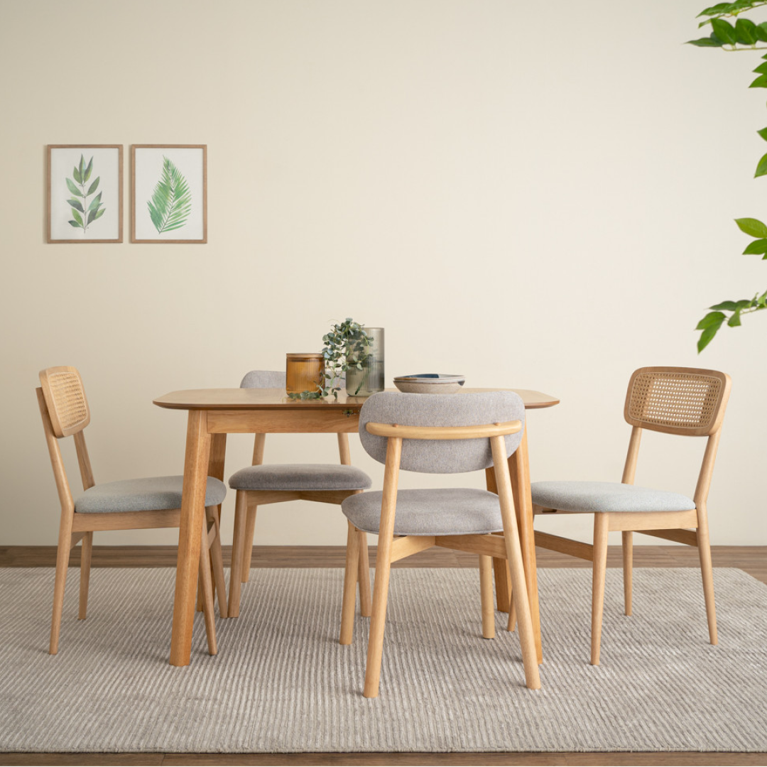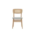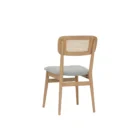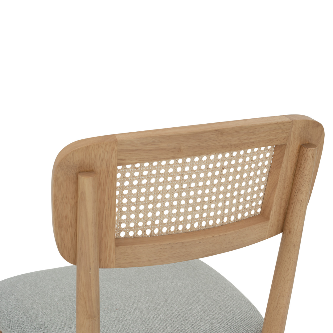 Its woven rattan backrest adds artisanal charm, while the Mint Grey Lake fabric cushion seat offers comfort and a refreshing colour contrast. The well-proportioned and ergonomic design ensures lasting support, making it ideal for everyday dining or extended seating occasions.