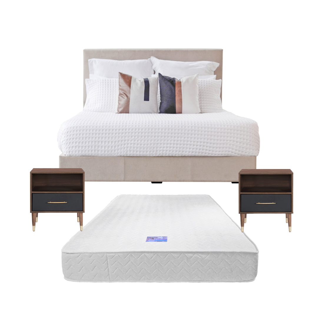 Transform your bedroom into a personal sanctuary with the Bedroom Set 2, a curated blend of comfort, elegance, and functionality. The set features the Freya Queen Bedframe with soft fabric upholstery and a contemporary silhouette, a plush Queen Mattress designed for restful sleep, and a pair of Sofie Bedside Tables crafted in engineered wood with sleek drawers and brass accented legs for modern sophistication.