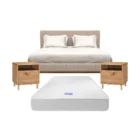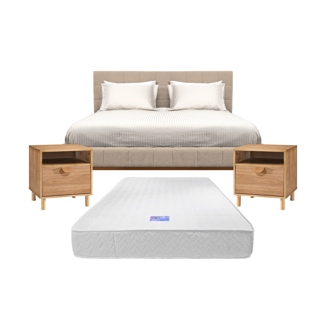 The centerpiece, the Alston Queen Bedframe, features a plush upholstered headboard with subtle tufting that adds a tailored touch of elegance. Paired with the Dreamland Cabana Queen Mattress, it offers a balanced blend of softness and support for superior sleeping comfort. Completing the ensemble, the Maia Bedside Tables — with their clean lines and natural wood finish — provide convenient bedside storage while enhancing the room’s cozy, contemporary feel.