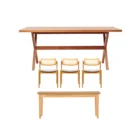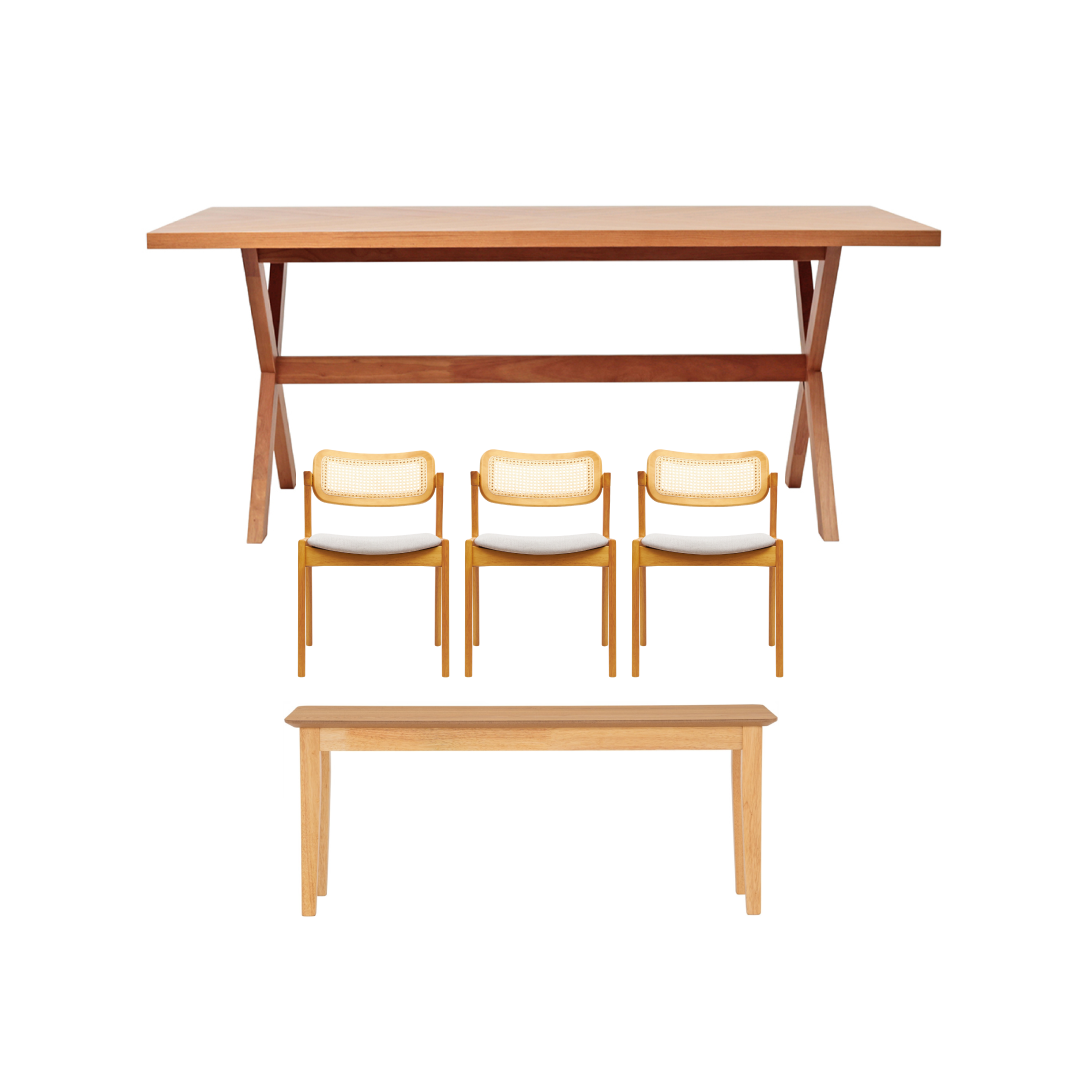 Discover the perfect balance of Japanese minimalism and Scandinavian warmth with the Japandi Dining Set, crafted to bring harmony and refined simplicity to your home. Anchored by the Laura Dining Table, made from solid wood with a clean, natural finish, this set pairs three Runa Dining Chairs featuring wooden frames, rattan backs, and upholstered seats, with the Leona 1.4M Bench for flexible seating and casual dining charm.
