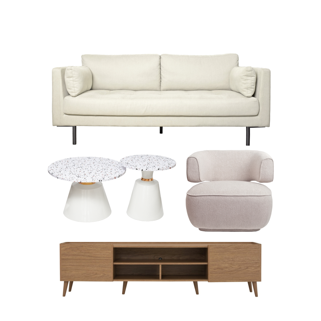 RM924.33 x 3 Months Create a calm, clutter-free home with the Minimalist Living Set, designed to embrace clean lines, soft textures, and timeless functionality. Anchored by the Herlene 3 Seater Sofa with fabric upholstery and slim legs, the set is complemented by the cozy Arlene Armchair for added comfort. The Luna Nesting Coffee Table, with its terrazzo-inspired tops and sleek sculptural bases, adds modern flair, while the Inglewood 1.8M TV Console provides practical storage with a natural wood finish.