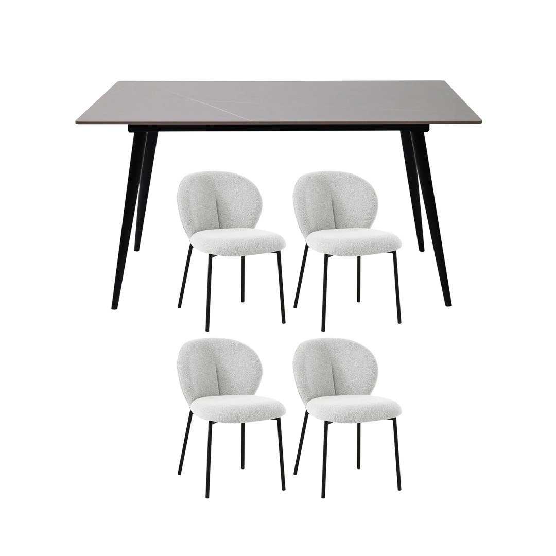 Bring balance and refined style to your dining space with the Monochromatic Dining Set, designed to highlight sleek forms and a harmonious color palette. The Lilia 1.4M Dining Table features a durable sintered stone top and slim black metal legs, offering both elegance and everyday resilience. Paired with four Erna Dining Chairs, upholstered in soft fabric with slim powder coated legs, this set creates a chic dining atmosphere that’s as functional as it is stylish.