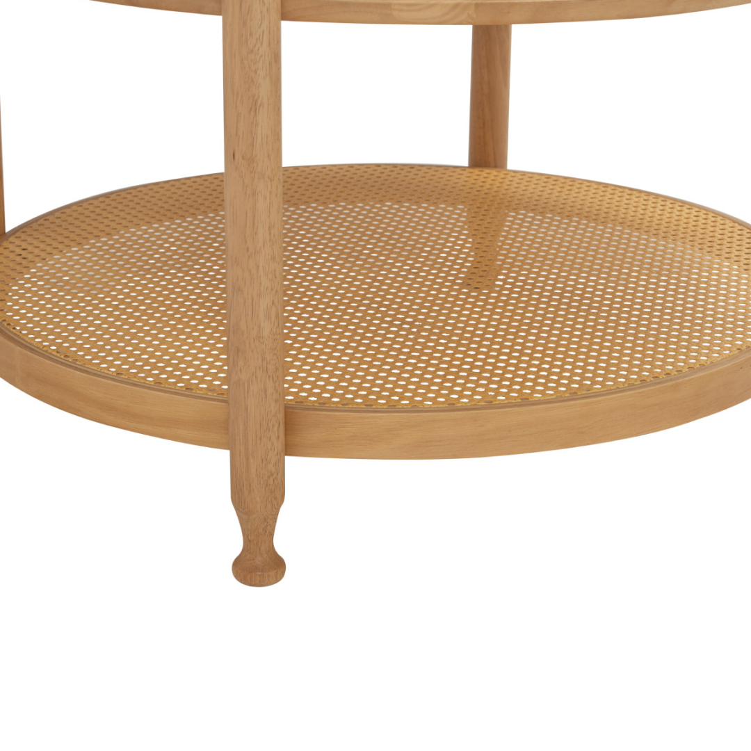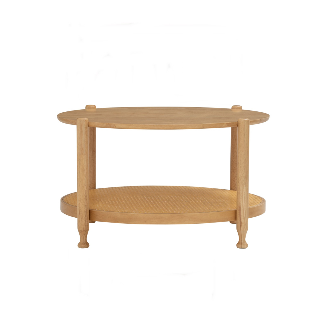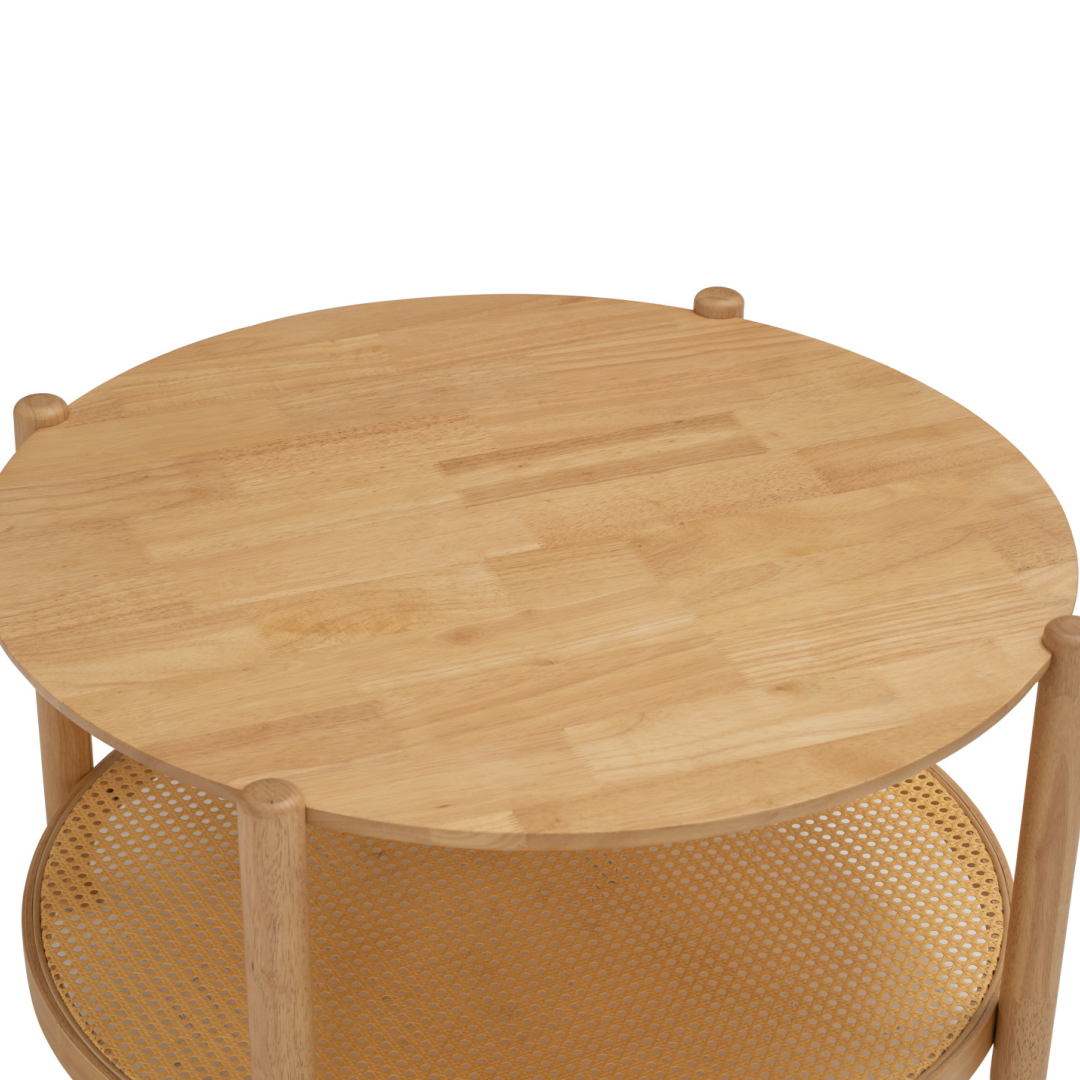 Its round silhouette creates a smooth, flowy layout that’s perfect for compact spaces or family-friendly environments — reducing sharp edges while enhancing visual balance. The spacious top offers room for décor, drinks, or daily essentials, while the rattan shelf provides additional storage without feeling bulky.