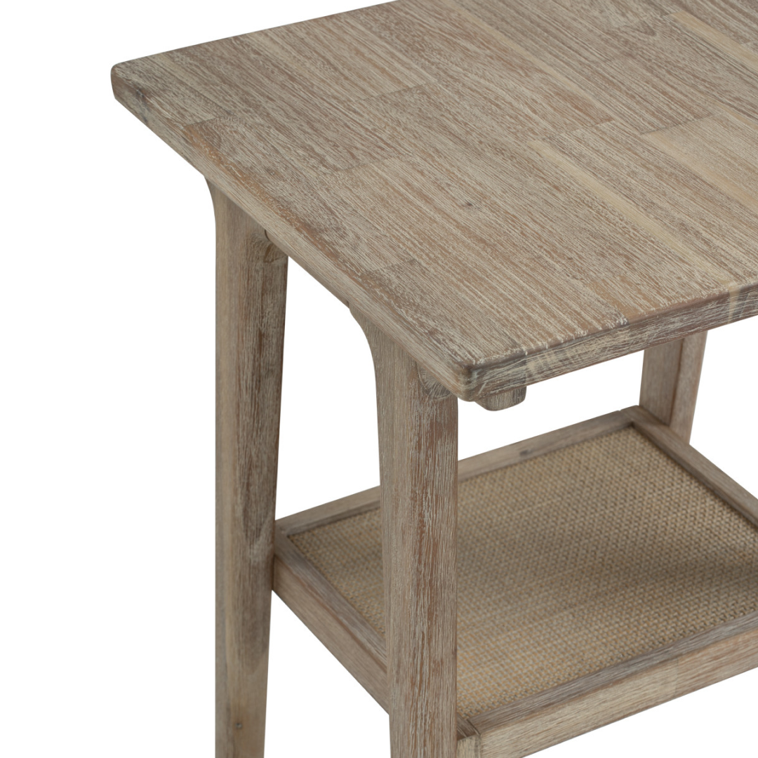 Finished in a rich Navara Ash tone, the Forres Big Side Table enhances interiors with visible wood grain and organic warmth. Its balanced square proportions provide generous surface space for lamps, décor, or daily essentials, while the rattan shelf adds both texture and convenient storage.