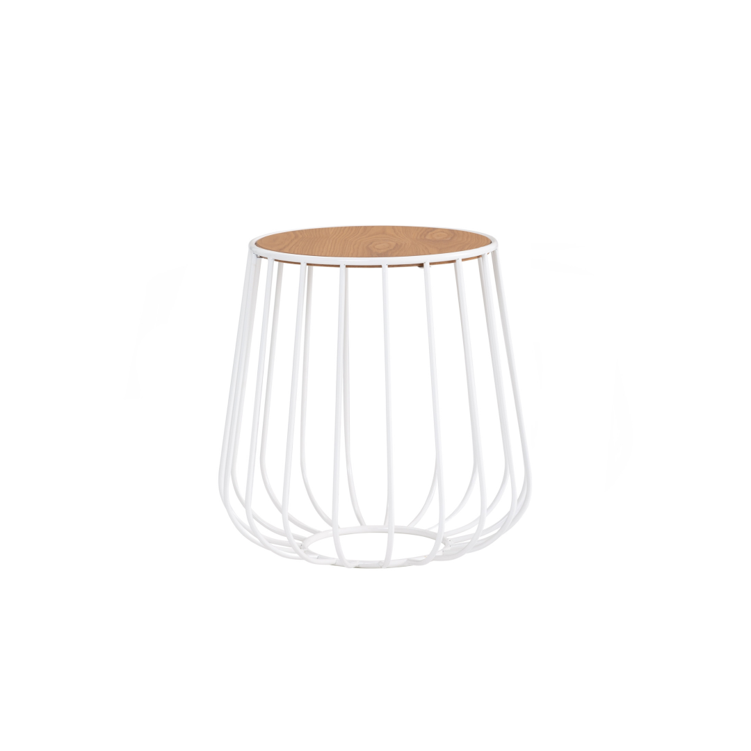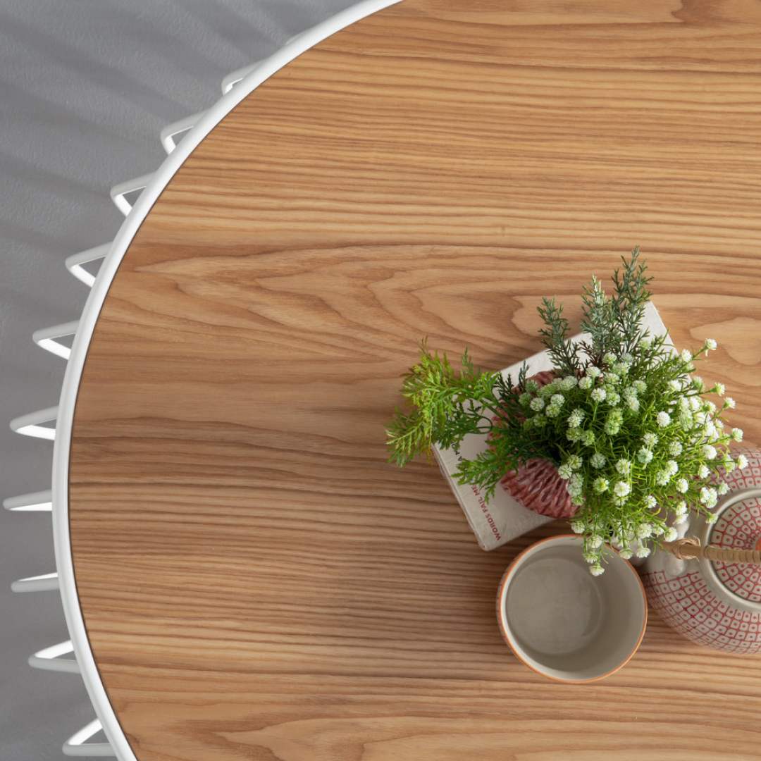 Crafted with a durable MDF top layered in veneer and a sturdy metal base, it ensures everyday strength while maintaining a light and airy visual presence. The natural wood tone softens the crisp white frame, creating a versatile piece that complements both neutral and bold interior palettes.